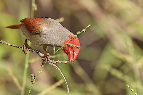 Female Crimson Finch feeds on roadside grass in Townsville Town Common Conservation Park. One of a few pairs lately showing signs of impending breeding.